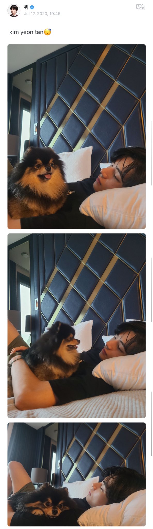 Después de ello subió una fotos adorables de el con Yeotan, que sabemos que con estas fotos ARMY es demasiado feliz.