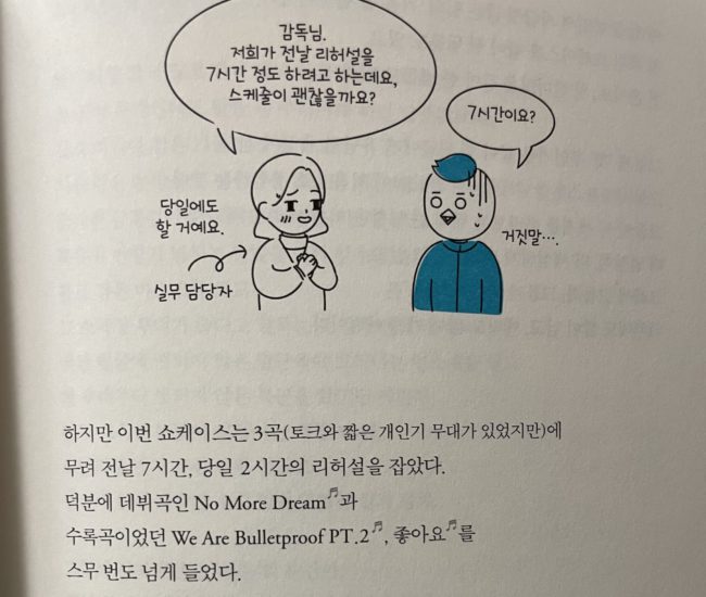 “El 13 de junio, el showcase de debut de BTS se llevó a cabo en Ilchi Art Hall, en una pequeña sala de espectáculos con capacidad para 250 personas, el tiempo de práctica esperado Es en su mayoría de 4 horas como máximo, incluso si es un concierto completo que contiene más de 20 canciones. Sin embargo para esta presentación BTS ensayó durante 7 horas la noche anterior y 2 horas el día del show y solo presentaron 3 canciones ‘No More Dream’, ‘We Are Bulletproof Pt. 2’ y ‘ I Like it’. El ensayo lo repitieron más de 20 veces”.